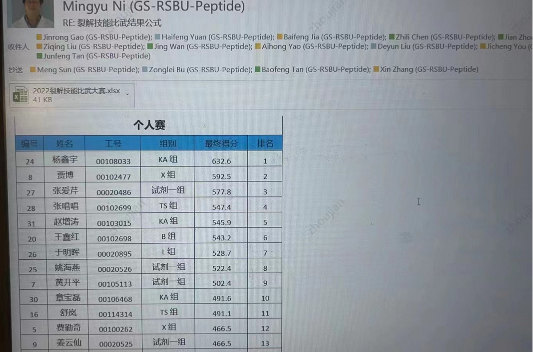 为促进实习生专业技能的快速提升,8月27日,江苏金斯瑞生物科技有限公司在所有实习生中举办多肽中控部裂解技能专项比赛,参加比赛的共有来自全国各高校的32名实习生,学历层次从专科到硕士,杨鑫宇以领先第二名40.1分的大优势分值荣获第一名。