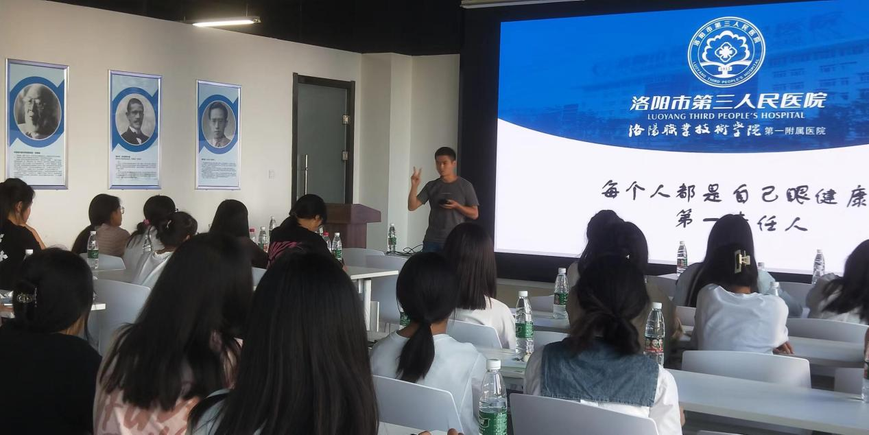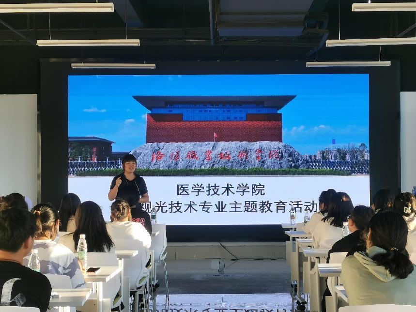 为使医学技术学院2022级眼视光技术专业新生对未来学习和就业方向有一个初步了解,切实了解专业发展方向,进而更好的进行职业生涯规划。9月29日下午,医学技术学院在眼视光技术专业实训基地开展眼视光技术专业专题教育活动。此次活动由医学技术学院副院长申绯翡主持,洛阳职业技术学院第一附属医院眼科主任宋华以及天津瞳欣科技有限责任公司经理商娜担任主讲。学院领导对本次活动高度重视,科研外事处处长杨少宗、副处长辛利军亲临现场并给予指导。