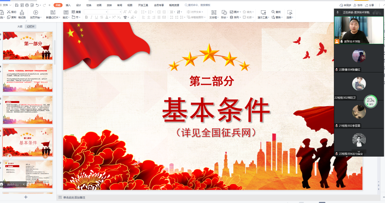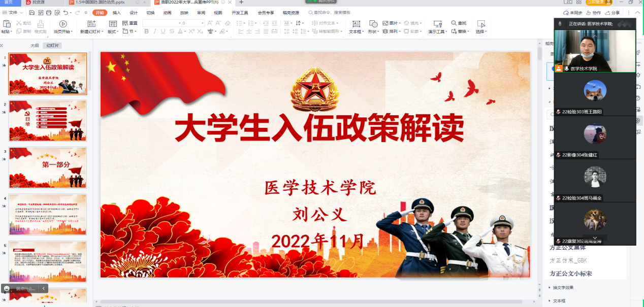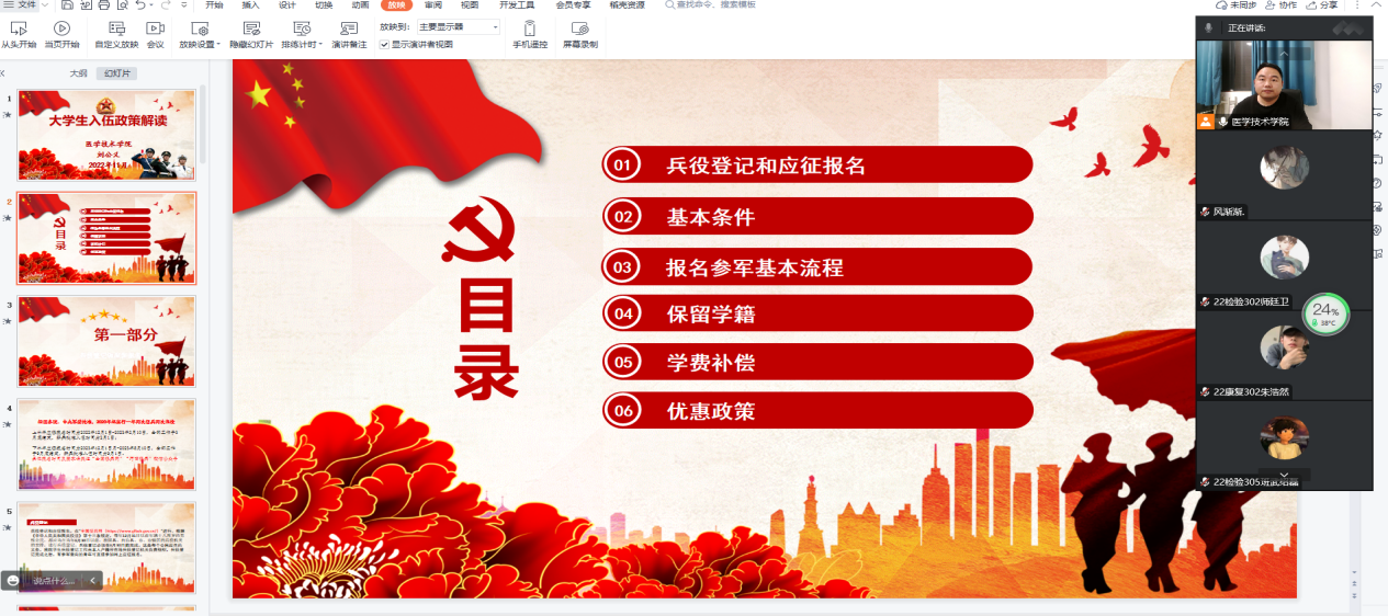 为推动国防教育入脑入心,激发学生的爱国参军热情,切实做好医学技术学院征兵工作,11月21日,医学技术学院国防教育专员、征兵专干刘公义组织全体学生开展腾讯会议线上大学生入伍政策解读讲座。
