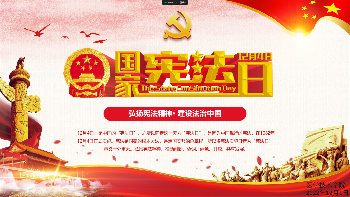 12月4日是我国第五个国家宪法日,为认真学习宣传贯彻党的二十大精神,增强学生的宪法意识,推动学生学习宣传宪法,弘扬宪法精神,维护宪法权威,近日,医学技术学院开展了“宪法宣传周”系列教育活动。
