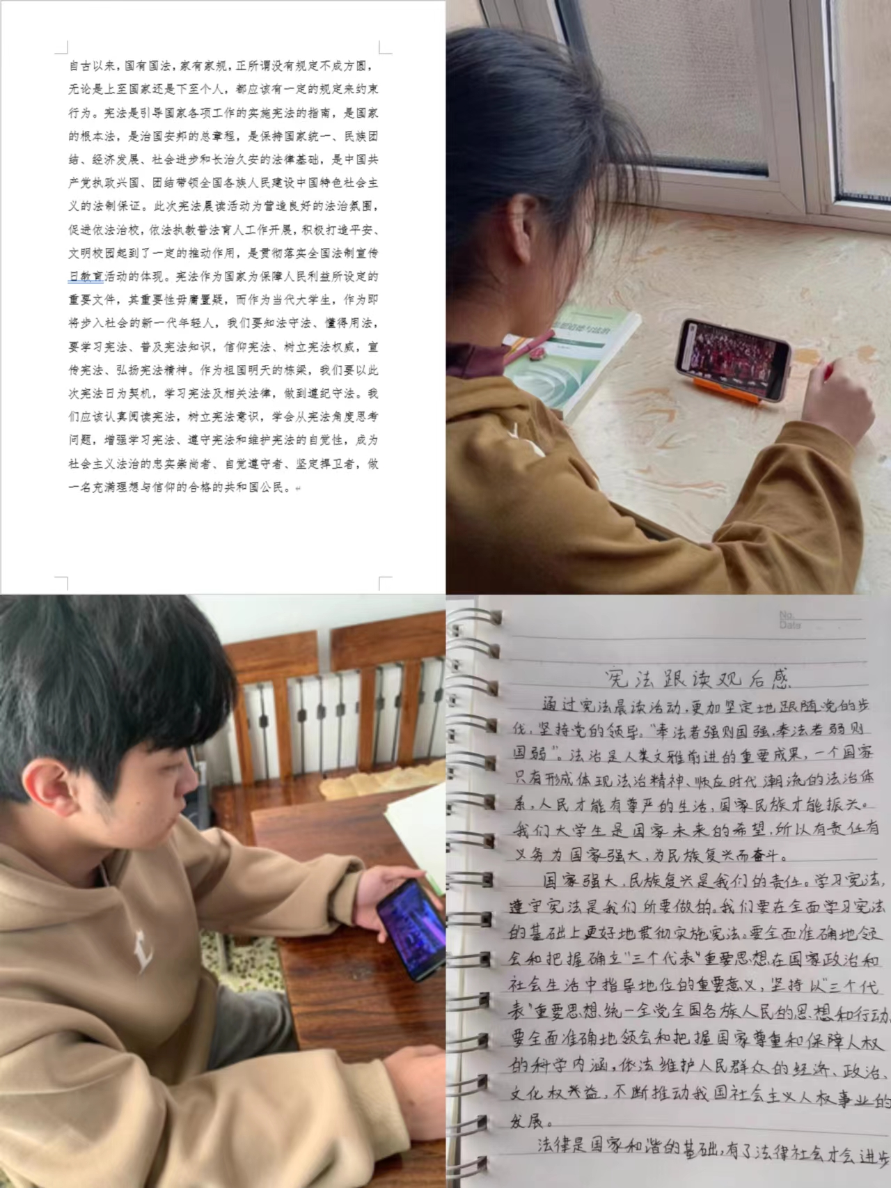 12月2日,医学技术学院组织学生观看“宪法晨读”并作出观看感悟,宪法是我们国家的根本大法,通过本次活动同学们学会了从宪法的角度思考问题,增强了学习宪法、遵守宪法、维护宪法的自觉性。