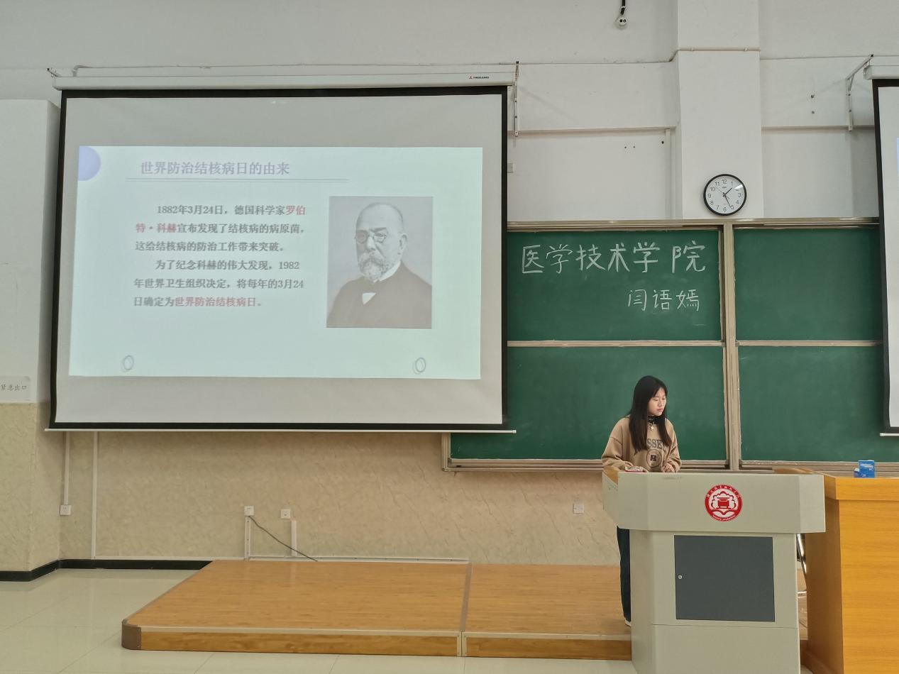 本次活动共有6名宣讲员,在通过了3月19日校医院主办的第一轮选拔赛后进入到今天的第二轮宣讲赛,他们以“你我共同努力,终结结核流行”为主题,从世界结核病日的由来、结核病概述、肺结核病的主要症状、肺结核的预防措施四个方面为公共基础教学部、信息工程学院和医学技术学院的76个班级进行了18场精彩的宣讲。通过此次宣讲,使同学们更加准确而深刻地了解了结核病,大家纷纷表示日后将更加注重自我保护,坚持不懈防治结核。