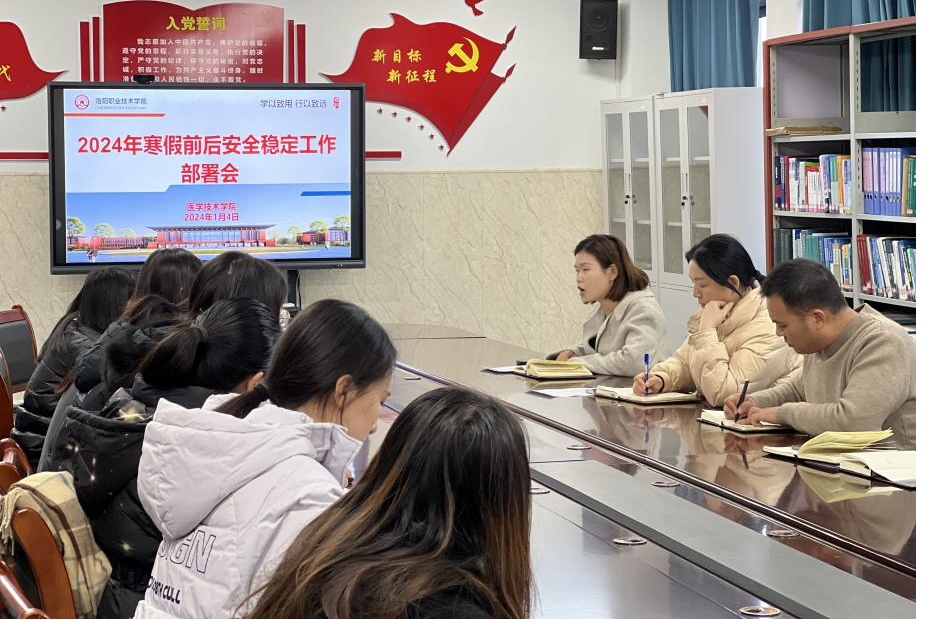 为切实提高学生安全意识,确保每位学生都能度过一个安全、愉快、充实的假期,1月4日,医学技术学院在412会议室召开2024年寒假前后安全稳定工作部署会,医学技术学院党总支书记尚艳芳、副书记侯浩朋及全体学工团队参加。