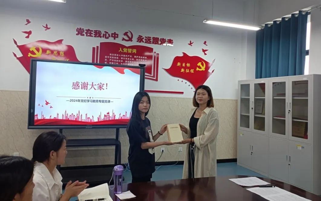 学生党支部书记董飘飘结合新修订的《中国共产党纪律处分条例》,为学院全体入党积极分子讲授了一堂生动深刻的党课。随后开展赠书送学活动,董飘飘勉励入党积极分子要珍惜这次赠书机会,认真阅读学习这些书籍,以习近平新时代中国特色社会主义思想为指引,不断提高思想政治觉悟,增强党性修养。最后医学技术学院党总支书记尚艳芳和副书记侯浩朋强调,入党积极分子要发挥先锋模范带头作用,将党纪学习教育融入日常、形成常态、成为习惯,真正做到用党规党纪校正思想和行动。