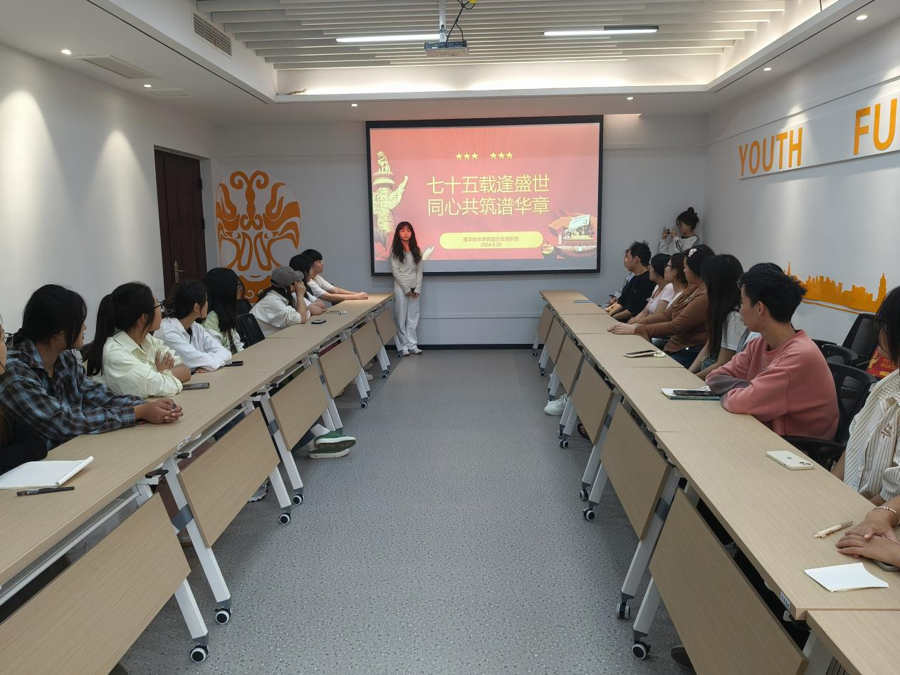 为热烈庆祝中华人民共和国成立75周年,深入学习贯彻党的二十大和二十届三中全会精神,切实落实立德树人根本任务,弘扬爱国主义精神,提升学生民族自豪感,激发师生爱国热情,9月26日,医学技术学院团总支组织带领同学们开展关于“七十五载逢盛世,同心共筑谱华章”为主题的第二课堂活动。