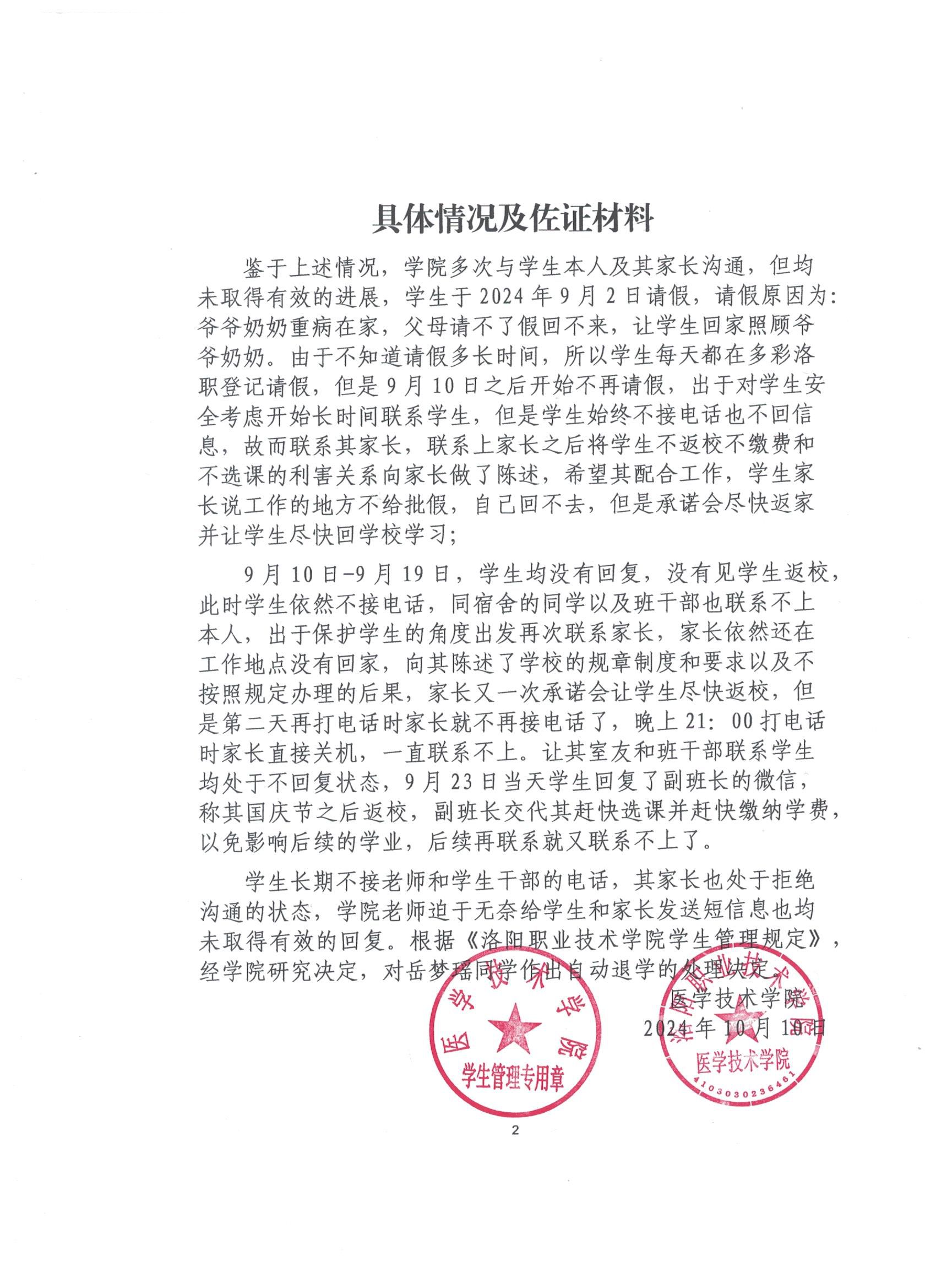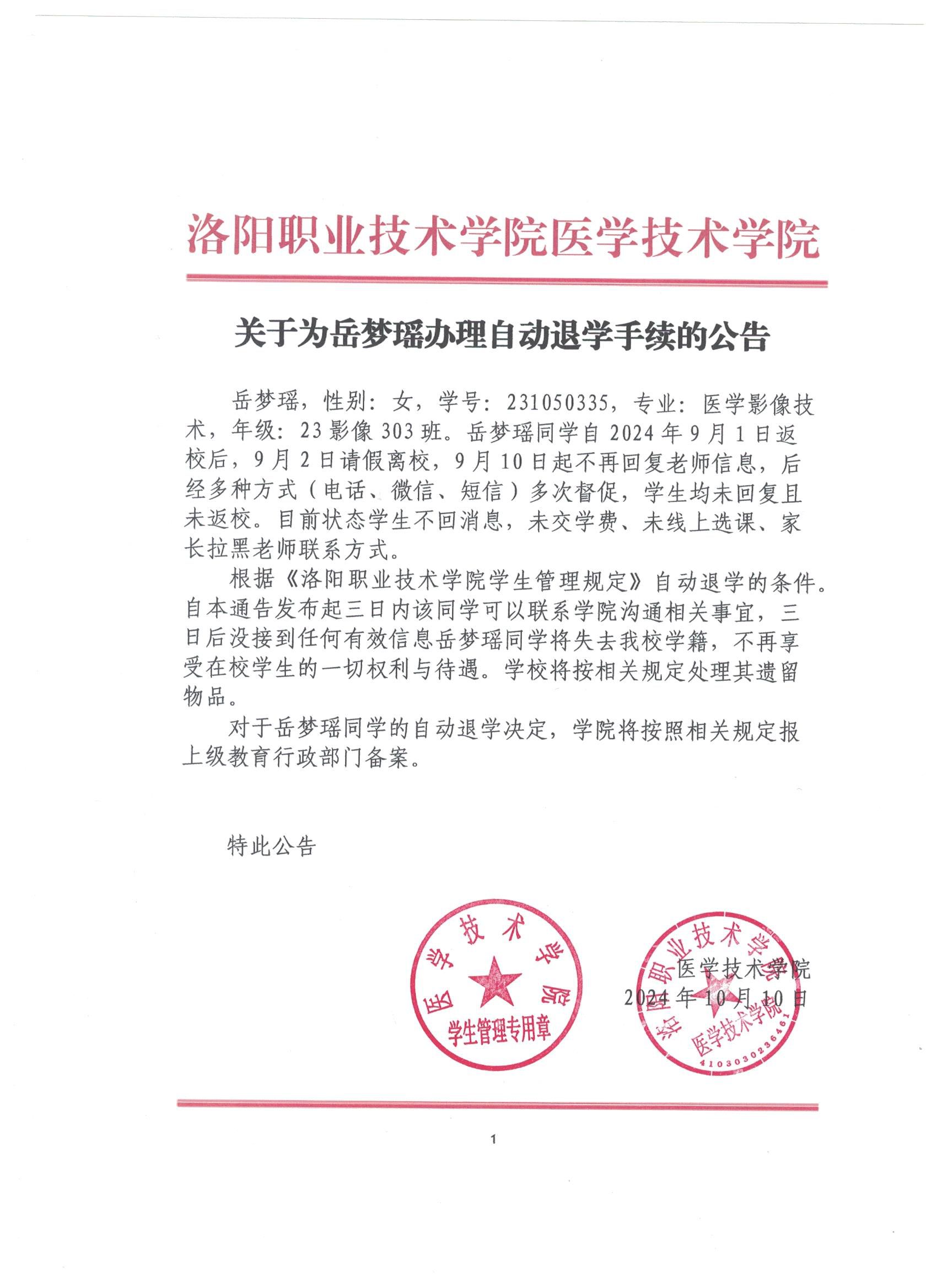 根据《洛阳职业技术学院学生管理规定》自动退学的条件。自本通告发布起三日内该同学可以联系学院沟通相关事宜,三日后没接到任何有效信息岳梦瑶同学将失去我校学籍,不再享受在校学生的一切权利与待遇。学校将按相关规定处理其遗留物品。