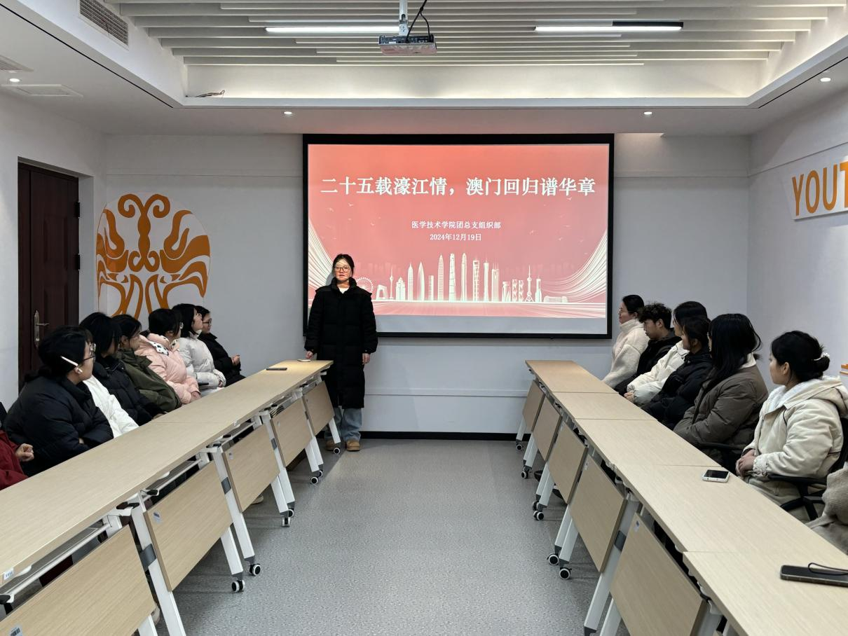 为庆祝澳门回归25周年,弘扬爱国主义精神,深入贯彻落实爱国主义教育,积极响应国家对青年一代培养爱国情怀与社会责任感的号召,12月19日,医学技术学院团总支开展了以“二十五载濠江情,澳门回归谱华章”为主题的第二课堂活动。