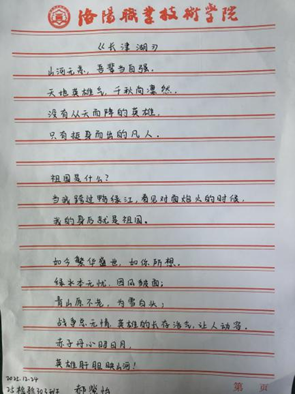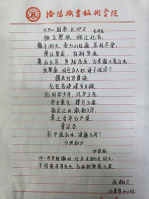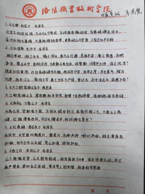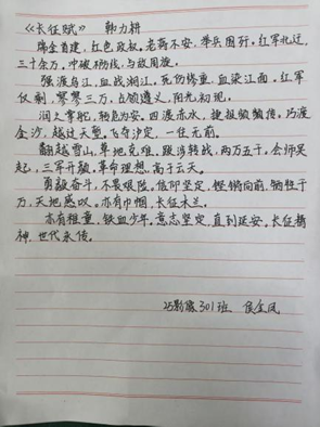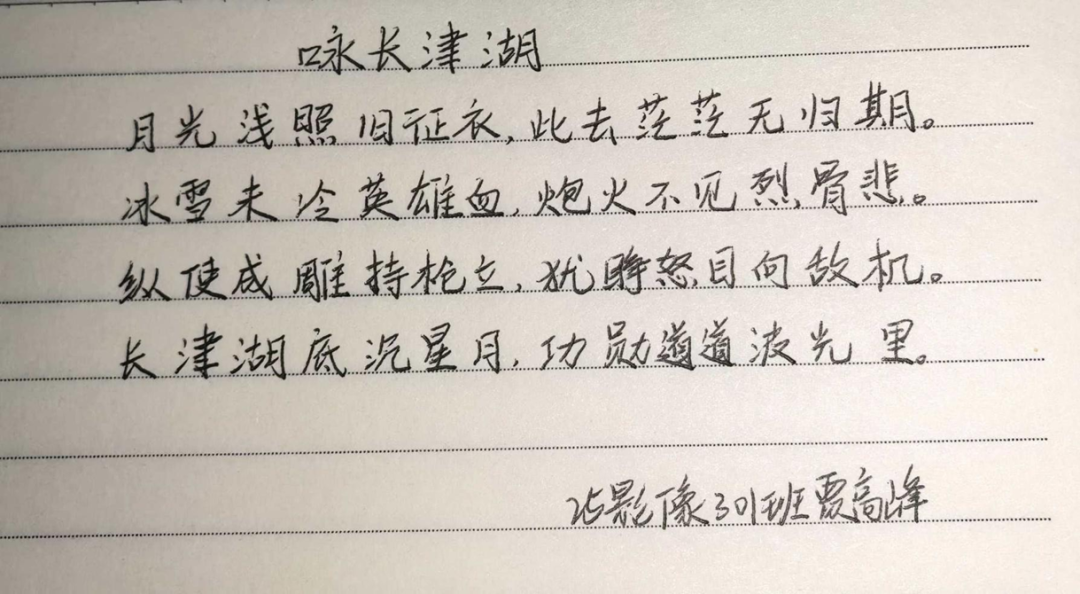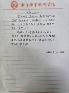 在红色诗词书法摘抄活动中,涌现出许多优秀作品。特别值得一提的是,25级医学影像技术301班贾高峰同学凭借其自创诗词作品荣获创意一等奖。贾高峰同学通过自创诗词,用真挚的情感和生动的语言,表达了对志愿军战士的无限敬仰和深切缅怀,展现了新时代青年学子的爱国情怀。