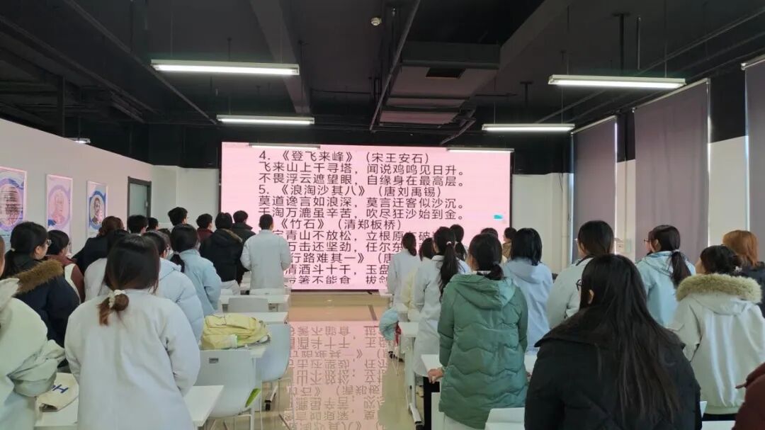 每日清晨8:10-8:20、午后13:50-14:00,各班级准时相约,从未间断。班委提前精心筹备素材、投屏展示,同学们精神饱满、声情并茂,或逐字诵读红色篇章,或齐唱激昂经典红歌。朗朗书声穿透廊道,动人旋律萦绕心间。原本短暂的课前时光,因这份日复一日的庄重与热忱,已成为医技学子每日的“精神必修课”——既迅速凝聚了学习状态,更让红色基因在潜移默化中深深扎根、茁壮生长。
