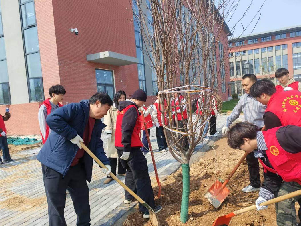春风拂面,新绿初绽。活动开始前,于幸福结合工匠精神和劳动育人为大家讲授了一堂生动的思政课。他指出,植树不仅是践行生态文明的生动实践,更是劳动教育、工匠精神培育的鲜活课堂。育苗需精耕细作,育人更要精益求精。希望全体师生在劳动中锤炼品格、涵养情怀,将精益求精、严谨务实的工匠精神融入专业学习与日常工作,以实干践行使命,以匠心守护初心。随后,于幸福为大家讲解植树要点和注意事项,并进行现场示范。师生们精神昂扬、分工协作,挥锹挖坑、扶苗栽种、覆土压实、提水浇灌,每一道工序都有条不紊、认真细致。老师们挥舞铁锹,同学们热情高涨,彼此配合默契,现场一派热火朝天的景象。经过共同努力,一棵棵树苗迎风而立,为春日校园增添了勃勃生机。